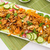 To serve, fill a salad bowl with shredded lettuce. Top with chicken, ramen, cucumbers, basil, mint, scallions, and almonds. Garnish with radishes and cucumbers.