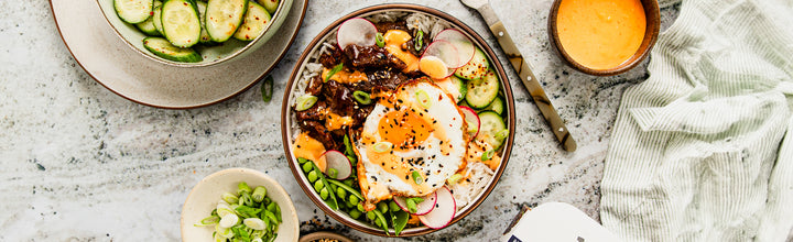 To serve, add a base of rice to each bowl. Top with beef, cucumber salad, spring peas, radishes, scallions, and a fried egg. Drizzle with spicy mayo and toasted sesame seeds. Enjoy!
