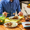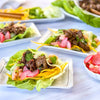 To serve, divide julienne yellow squash and celery ribbons onto six butter lettuce leaves. Top lettuce wraps with Teriyaki Beef and fresh scallion greens, and pickled apples and radishes. Garnish with mint leaves. Wrap lettuce leaves like a taco and enjoy!