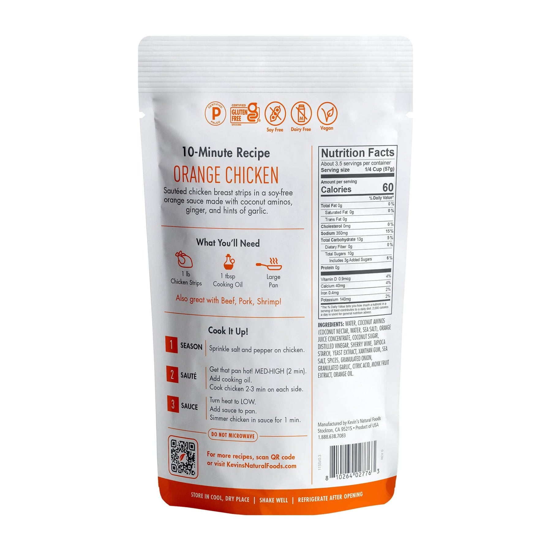Water, Coconut Aminos (Coconut Nectar, Water, Sea Salt), Orange Juice Concentrate, Coconut Sugar, Distilled Vinegar, Sherry Wine, Tapioca Starch, Yeast Extract, Xanthan Gum, Sea Salt, Spices, Granulated Onion, Granulated Garlic, Citric Acid, Monk Fruit Extract, Orange Oil.