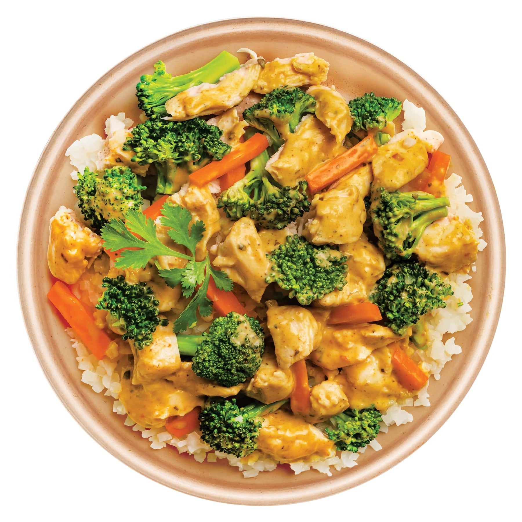 Chicken (Boneless Skinless Chicken Breast, Water, Vinegar, Yeast Extract, Sea Salt, Cultured Onion Juice, Xanthan Gum, Black Pepper, Citrus Extract), Thai Coconut Sauce (Coconut Milk [Coconut Cream, Water], Water, Coconut Sugar, Lemongrass Puree [Lemongrass, Water], Spices, Lime Juice Concentrate, Basil, Yeast Extract, Chicken Stock [Chicken Stock, Salt], Dehydrated Onion, Dehydrated Garlic, Xanthan Gum, Sea Salt, Roasted Garlic, Tapioca Starch, Chiles, Monk Fruit Extract), Cauliflower Rice (Cauliflower), Broccoli, Carrots.