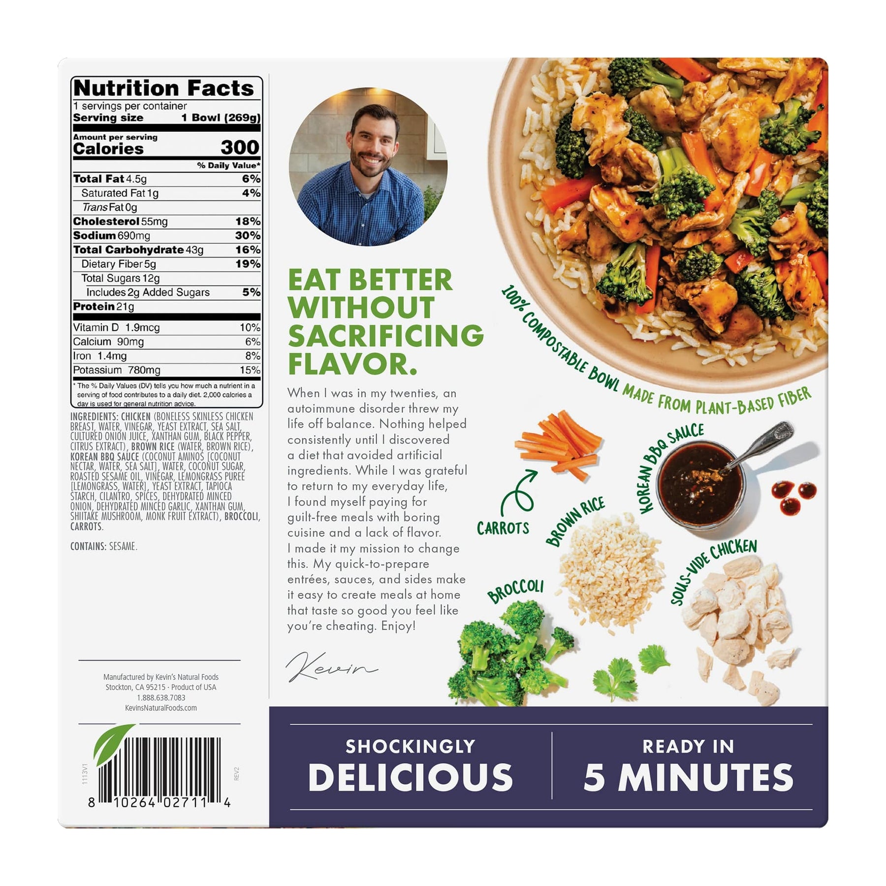 Chicken (Boneless Skinless Chicken Breast, Water, Vinegar, Yeast Extract, Sea Salt, Cultured Onion Juice, Xanthan Gum, Black Pepper, Citrus Extract), Brown Rice (Water, Brown Rice), Korean Bbq Sauce (Coconut Aminos [Coconut Nectar, Water, Sea Salt], Water, Coconut Sugar, Roasted Sesame Oil, Vinegar, Lemongrass Puree [Lemongrass, Water], Yeast Extract, Cilantro, Spices, Dehydrated Minced Onion, Tapioca Starch, Dehydrated Minced Garlic, Xanthan Gum, Shiitake Mushroom, Monk Fruit Extract), Broccoli, Carrots.